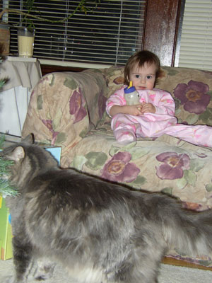 Charlotte and the kitty (who's chewing on the tree.... great!)