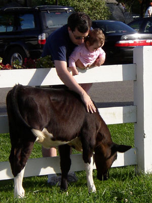 Daddy is helping me pat a baby cow