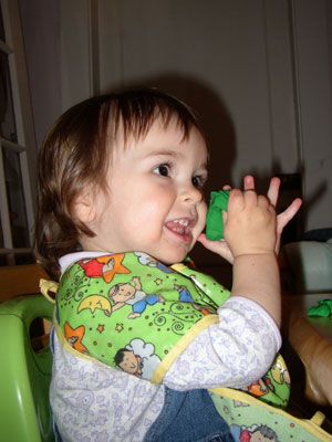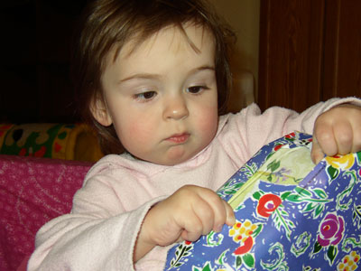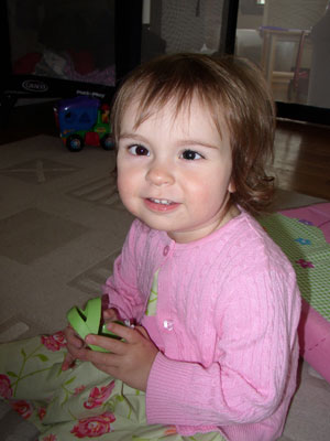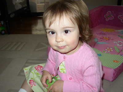 Charlotte had the stomach flu when we got home from California -- poor thing! She is obviously a bit green around the gills in this picture, but it's the first gift she ever unwrapped all by herself. (Easter gift from Grandma!)