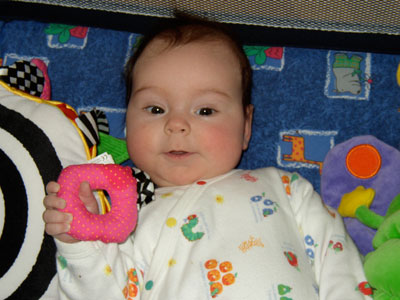 Mommy interrupts me at my playtime to take a picture of me in my cute new baby jeans