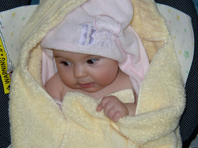 Wrapped up in her towels, ready to be put in bathtub