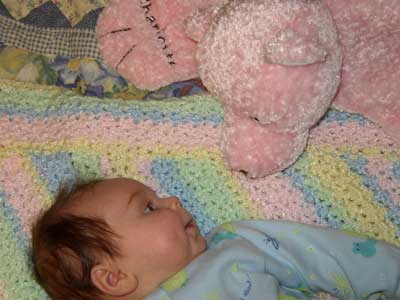 At her two month appointment on Dec. 15th, she was 14 pounds and 24" long. Wow!