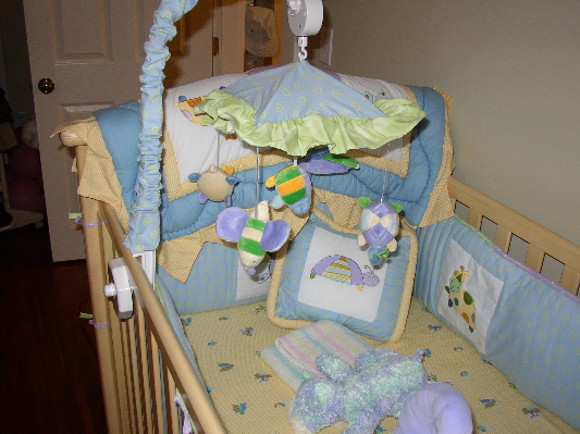 Here is her crib, with many of the beautiful things we have been given as gifts.