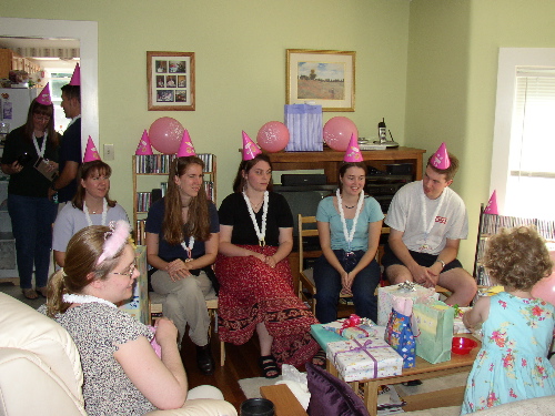 We had a wonderful baby shower today. It was such a surprise. I thought we were having a party for Beth, Geoff, Sophie, and Daniel to celebrate his arrival on July 23rd, and we did, but after about an hour they all put on pink party hats while I was out of the room! I really think there's something about being pregnant that makes it easier for people to plan surprise parties for you! (easily distracted, etc.!) It was a great day, and here are some pictures.
