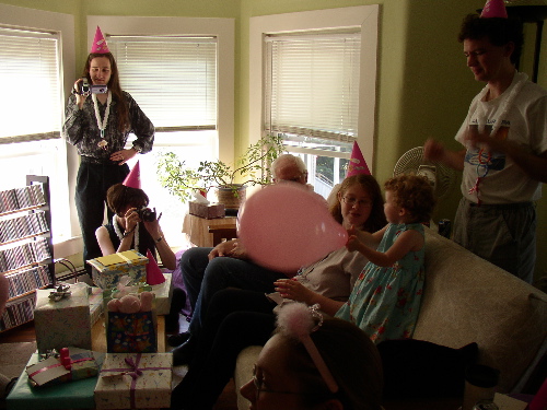 The other side of the room! L to R: Jason, Anne (with camera), Jim (behind balloon), Beth, Sophie, Geoff