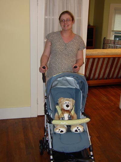 Here's our stroller, which just arrived Saturday, a gift from Charlotte's Grandma Cooper! We had to put Teddy in it to show how cute it will be with a real baby riding inside. (I would have borrowed Daniel to be our model, but he was asleep when I thought of it during the shower!)