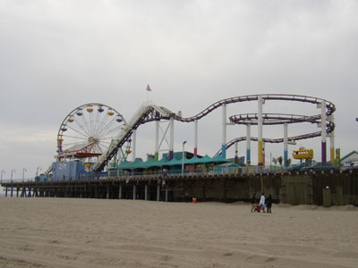 The Santa Monica Pier. Charlotte busted through the partway opened gate into the closed kiddie playland while she was on her harness. I didn't fit through the gap, so I had to go in after her! Ha! Luckily, the people working on the rides were good sports!
