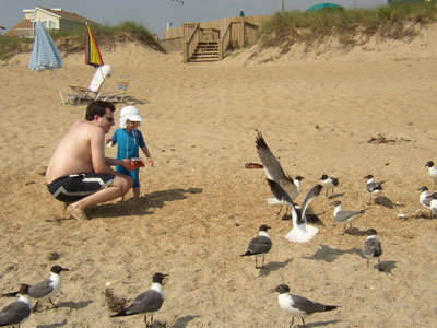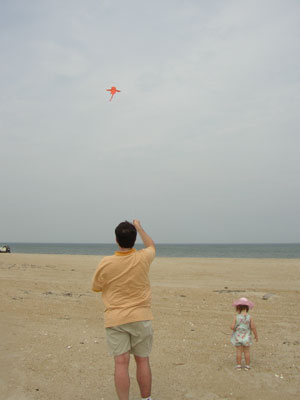 We drove down to Hatteras Island in the afternoon. It was a lovely drive through the sand dunes. After lunch at an Australian restaurant, (where Chris was disappointed they were out of kangaroo burgers-- heh!) we bought a kite at one of the omnipresent Kitty Hawk Kites shops. Charlotte has always enjoyed watching them and we thought it would be nice to have one of our own.