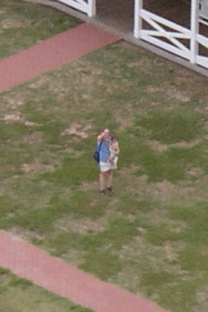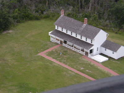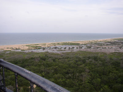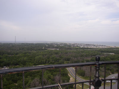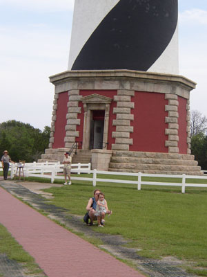 After kite flying, we drove down to Buxton to visit the Cape Hatteras Lighthouse. It's the lighthouse you usually see on postcards, ornamental plates, etc. It was moved a few years ago to escape coastal erosion. We discovered that Charlotte would not be allowed inside, so Chris did the climb by himself, and baby and I took a stroll around the grounds, counting grasshoppers.